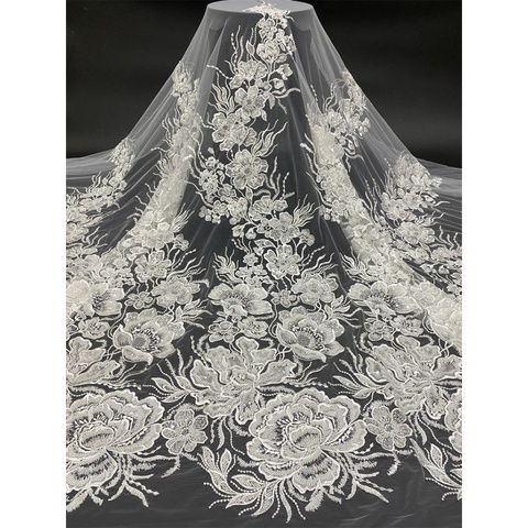 Tessuto di pizzo da sposa floreale con paillettes di perline di alta qualità materiale di lusso bianco 3D fiore con paillettes in rilievo abito da sposa tessuti di pizzo